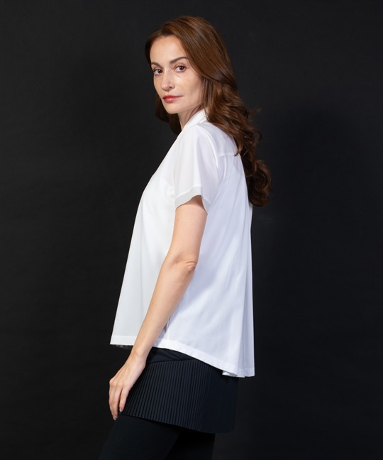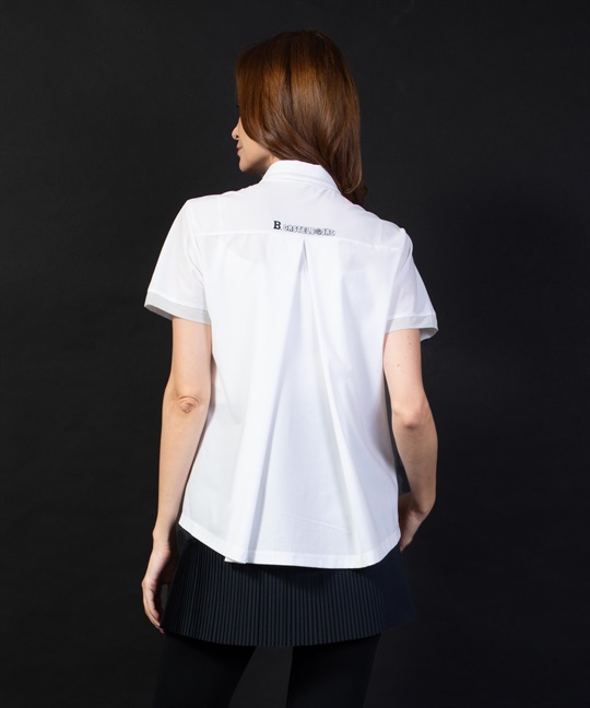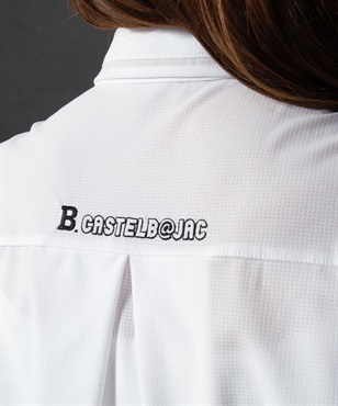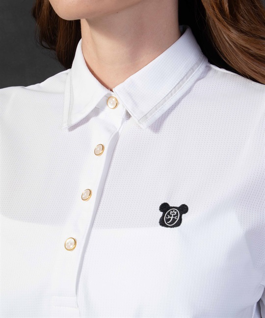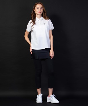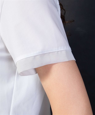 透け感のある薄手素材「FLEXDRY」を使った半袖ポロ。後ろのタック、衿の切替と袖にあしらわれたオーガンジー素材が女性らしさを演出。裾をそのまま出して着ても、ボトムにインしてもシルエットが保たれていい感じにコーディネートが楽しめます。