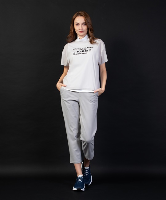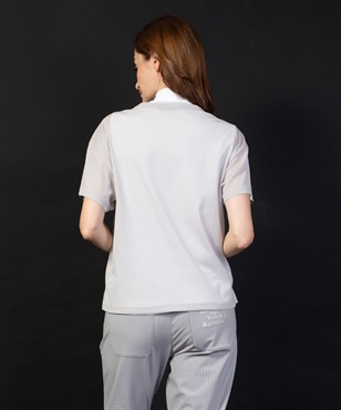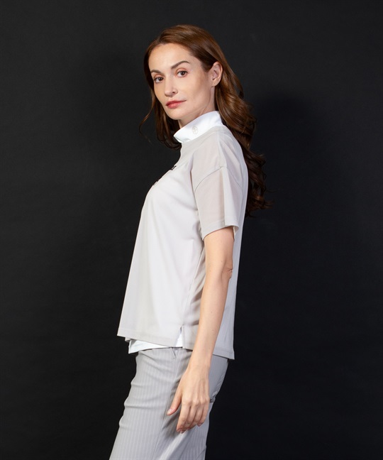ストレッチ性が高いパワーネット素材のオーバーシルエットの半袖Tシャツとソフトな肌触りのハイネックノースリーブTシャツセット。インに着るものをキャミソールに変えてタウン用、長袖ハイネックを合わせてUV対策をしてGOLF用と活用度の高いアイテムです。