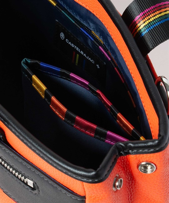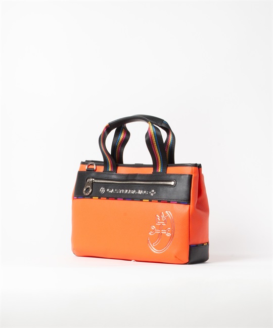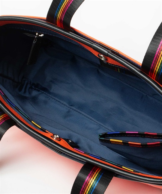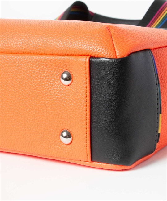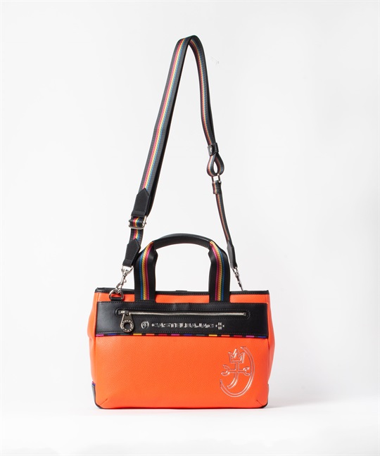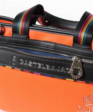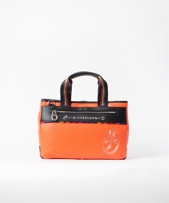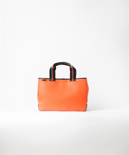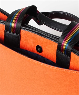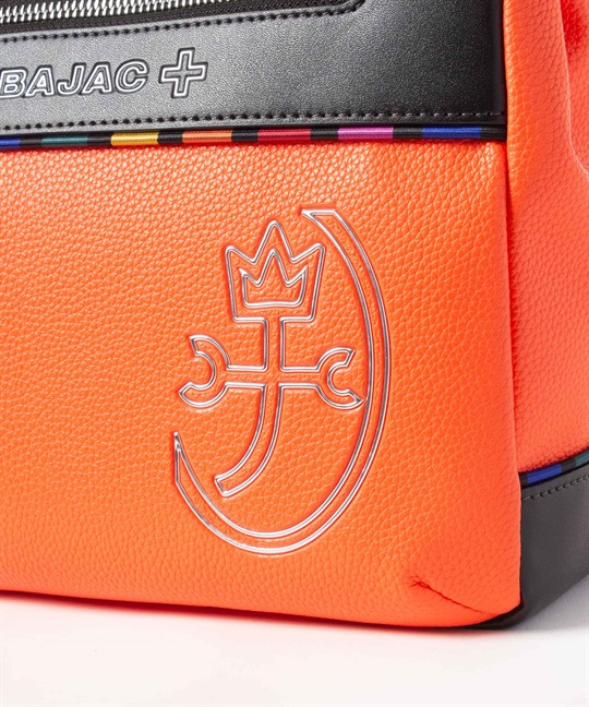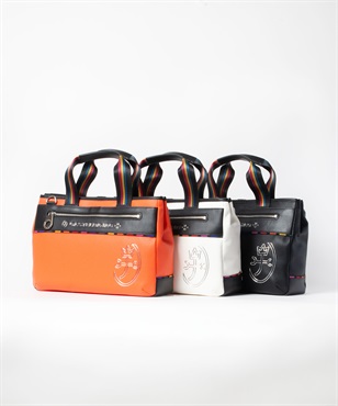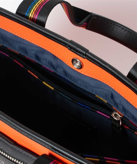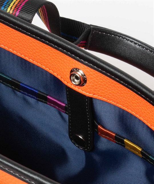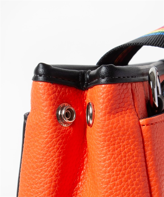 シボ感のハッキリとしたシュリンク調合皮を使用。PVCをベースにしてトップをPUで仕上げた耐久性が高く、加水分解のしにくいセミ合皮タイプの素材になります。ブランドアイコンであるマルチストライプのジャガード生地をポイントにして、パイピングや内装生地の一部に使用しています。金属調シリコンによる特殊なロゴ表現もポイントになります。凹み部分に金属調シリコンを埋め込むような表現になり、凹凸の少ないフラットな表現になります。