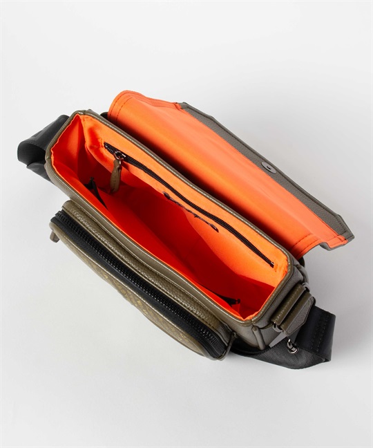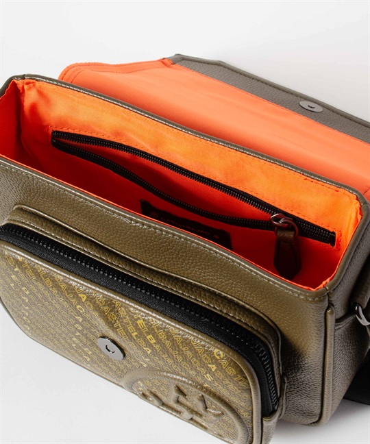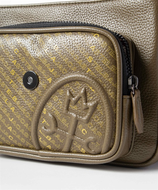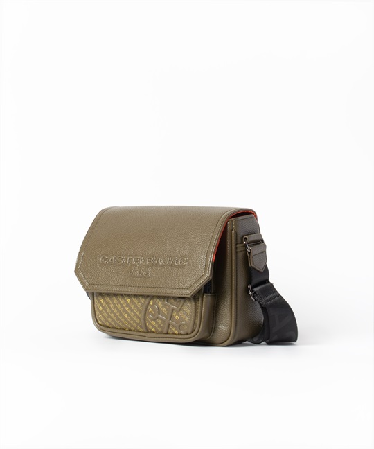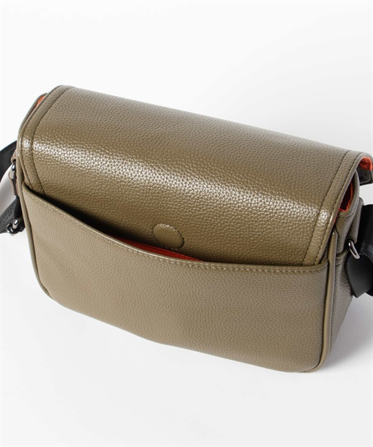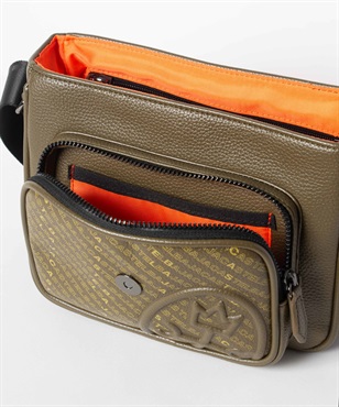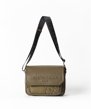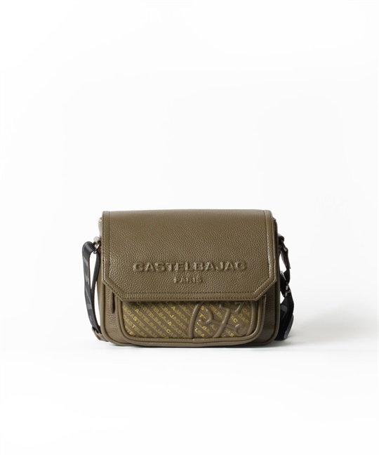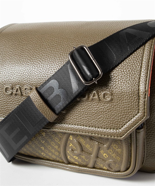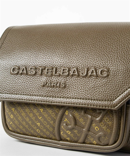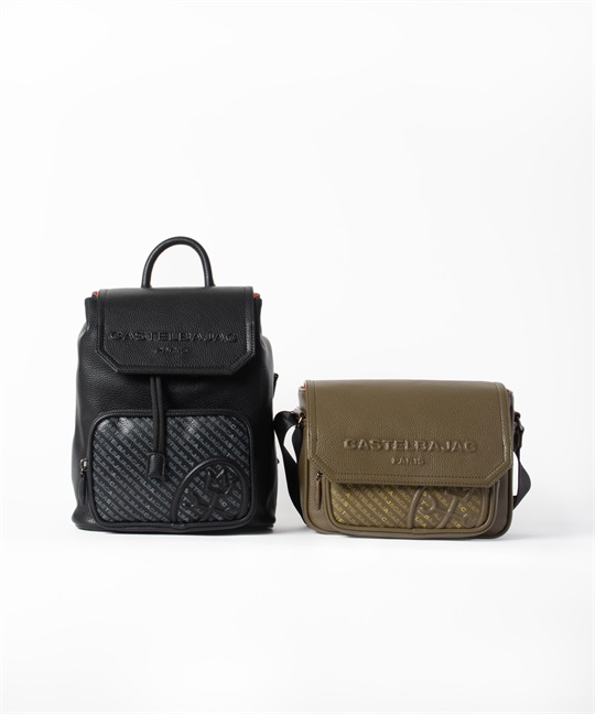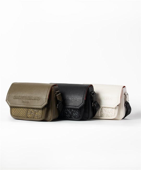2種類のブランドロゴ表現が目を引く、カステルバジャックのミニショルダーバッグ。フラップには立体感のあるエンボスロゴを、前面ポケットにはブランドロゴを連ねたアイコニックなパターンをあしらい、シンプルでありながら上品な存在感を放つデザインに仕上げています。本体素材には、扱いやすく美しい質感の合成皮革を使用しています。メインルームは長財布や500mlペットボトルが横向きにぴったり収まるコンパクトなサイズ感で、オープンポケットが1つとファスナーポケットが1つあります。前面にはファスナーポケットがあり、内側にオープンポケットが1つあります。背面にもマグホックポケットがあり、すぐ取り出したいものの収納に便利です。