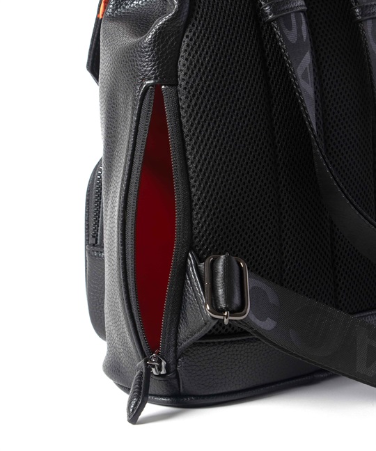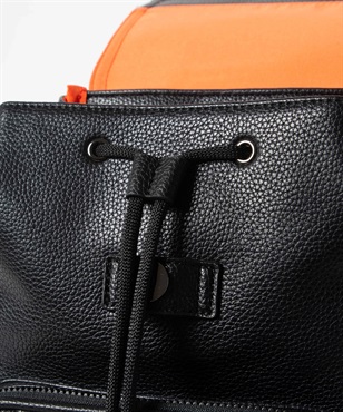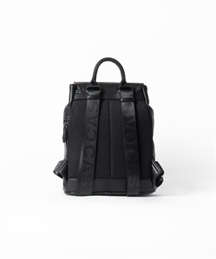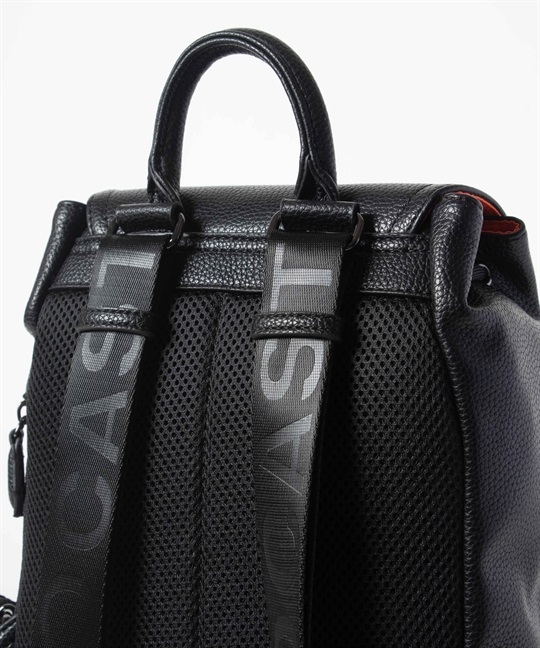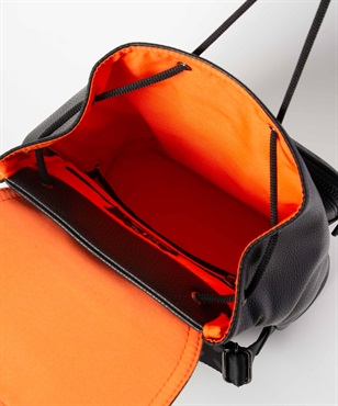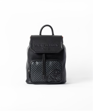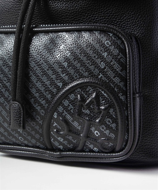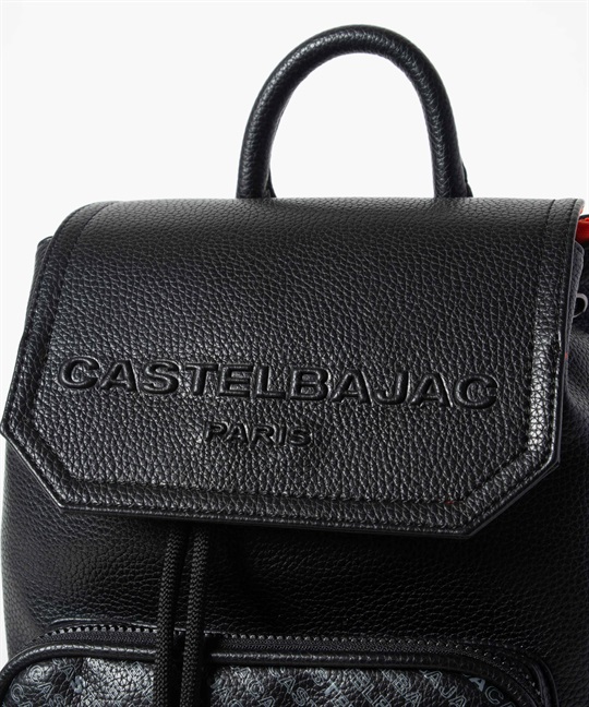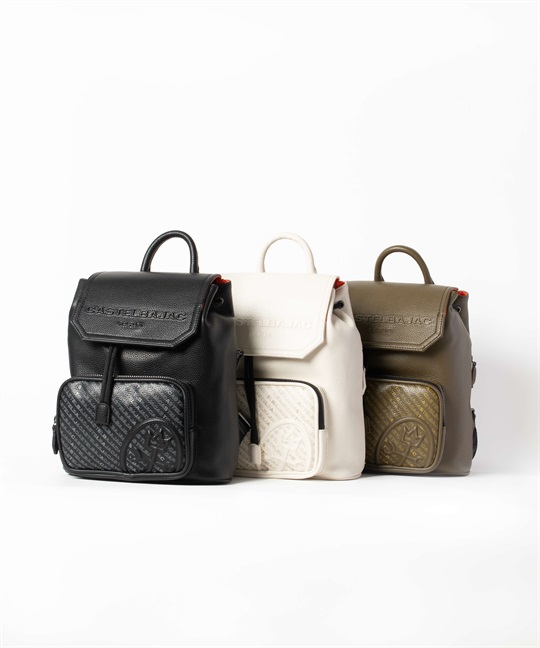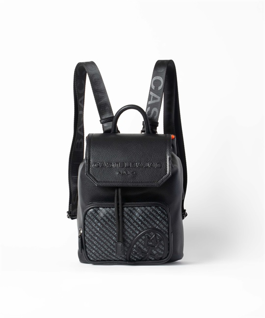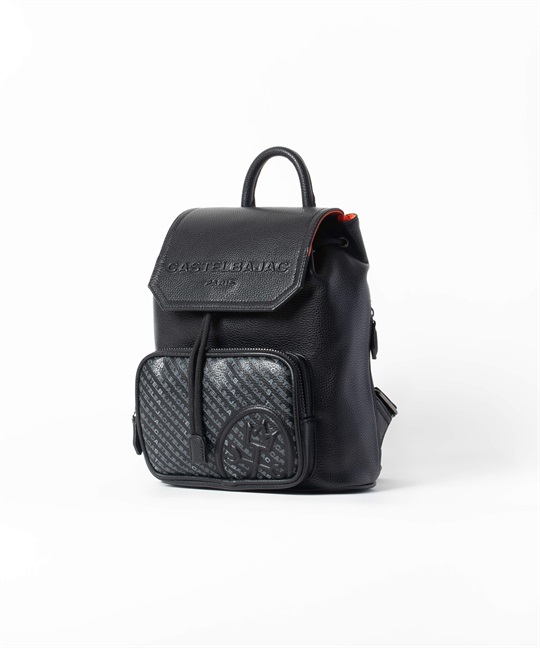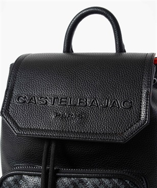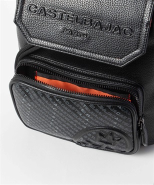 2種類のブランドロゴ表現が目を引く、カステルバジャックのカジュアルミニリュック。フラップには立体感のあるエンボスロゴを、前面ポケットにはブランドロゴを連ねたアイコニックなパターンをあしらい、シンプルでありながら上品な存在感を放つデザインに仕上げています。本体素材には、扱いやすく美しい質感の合成皮革を使用しています。500mlのペットボトルがぴったり収まるコンパクトなサイズ感。メインルームは開閉しやすいドローストリング式を採用しており、オープンポケットが1つとファスナーポケットが1つあります。前面にはファスナーポケットがあり、内側にオープンポケットが1つあります。さらにサイドには、メインルームへ直接アクセスできるファスナーポケットがあり、荷物の出し入れをスムーズにしてくれる、使い勝手に優れた収納設計です。
