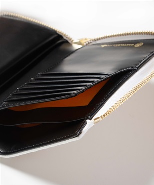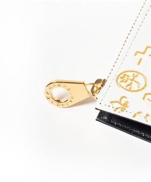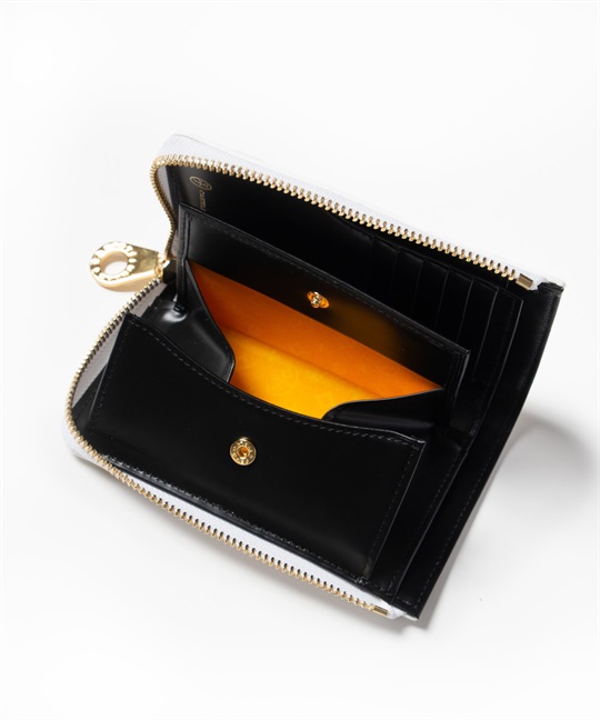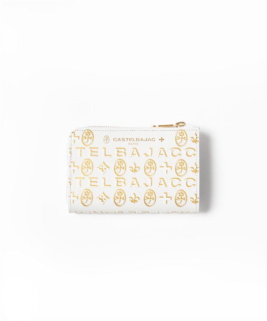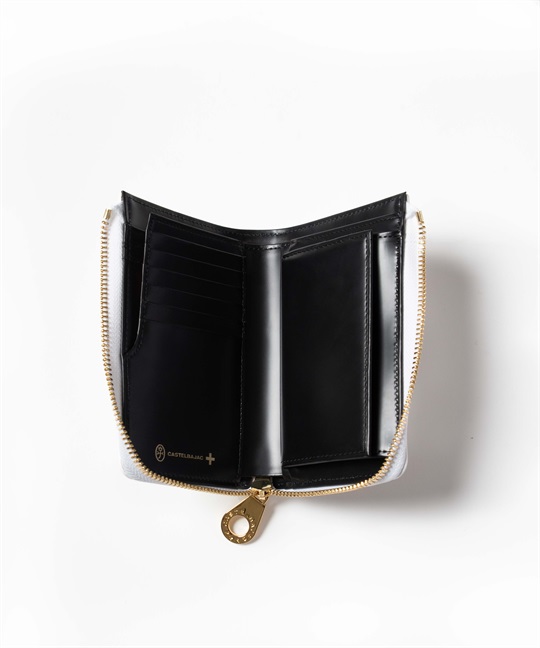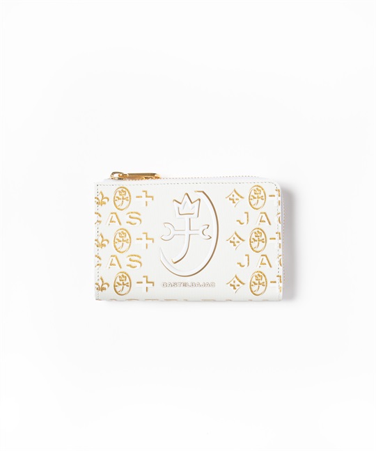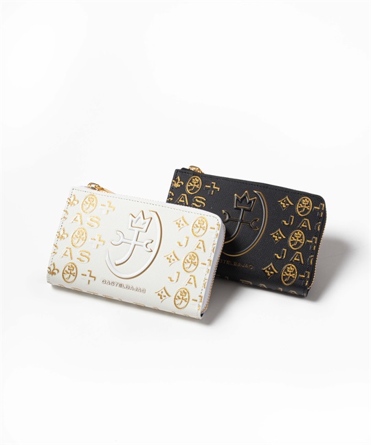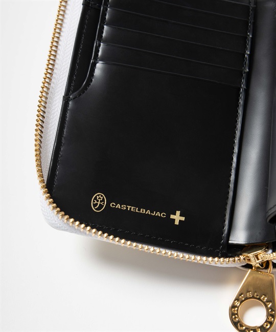 ゴールドプリントが華やかなカステルバジャックのL字ファスナーセミ長財布。長財布よりもコンパクトですが、通常の折り財布よりも一回り大きいセミハーフサイズで、収納力抜群です。ゴールドの星屑が散りばめられたような、シャイニーで華やかな財布シリーズです。中央のブランド家紋はぷっくりと立体的に盛り上げています。バックプリントのデザインも魅力です。L字ファスナーセミ長財布を開くと、カード段が6つ、ポケットが3つ、札入れが2つ、小銭入れが1つあります。小銭入れはボックス型で大きく開くため、中身が見やすく小銭の出し入れもしやすい設計です。札入れスペースも2つあるため、現金とレシート類を分けて収納可能です。