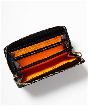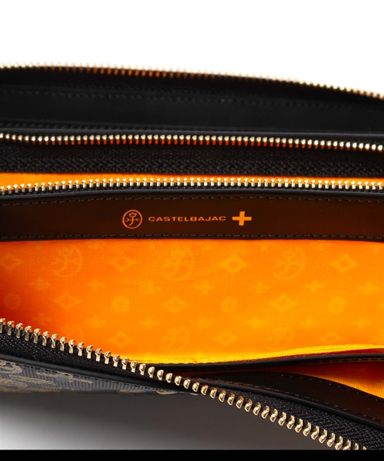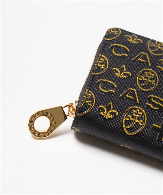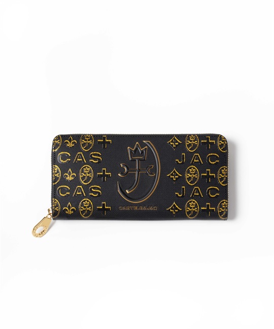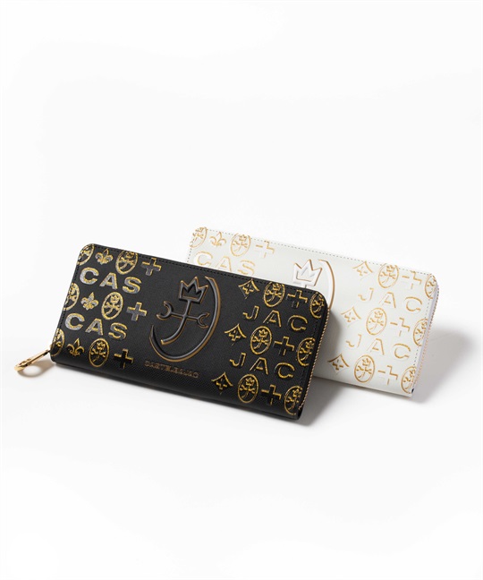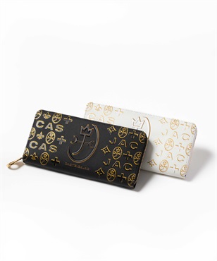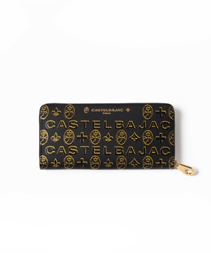 ゴールドプリントが華やかなカステルバジャックのラウンドファスナー長財布。ラウンドファスナーで大きく開き、収納力も抜群です。ゴールドの星屑が散りばめられたような、シャイニーで華やかな財布シリーズです。中央のブランド家紋はぷっくりと立体的に盛り上げています。バックプリントのデザインも魅力です。ラウンドファスナー長財布を開くと、カード段が12、ポケットが2つ、札入れが2つ、小銭入れが1つあります。小銭入れはL字ファスナーになっており、中身が見やすく小銭の出し入れもしやすい設計です。札入れスペースも2つあるため、現金とレシート類を分けて収納可能です。